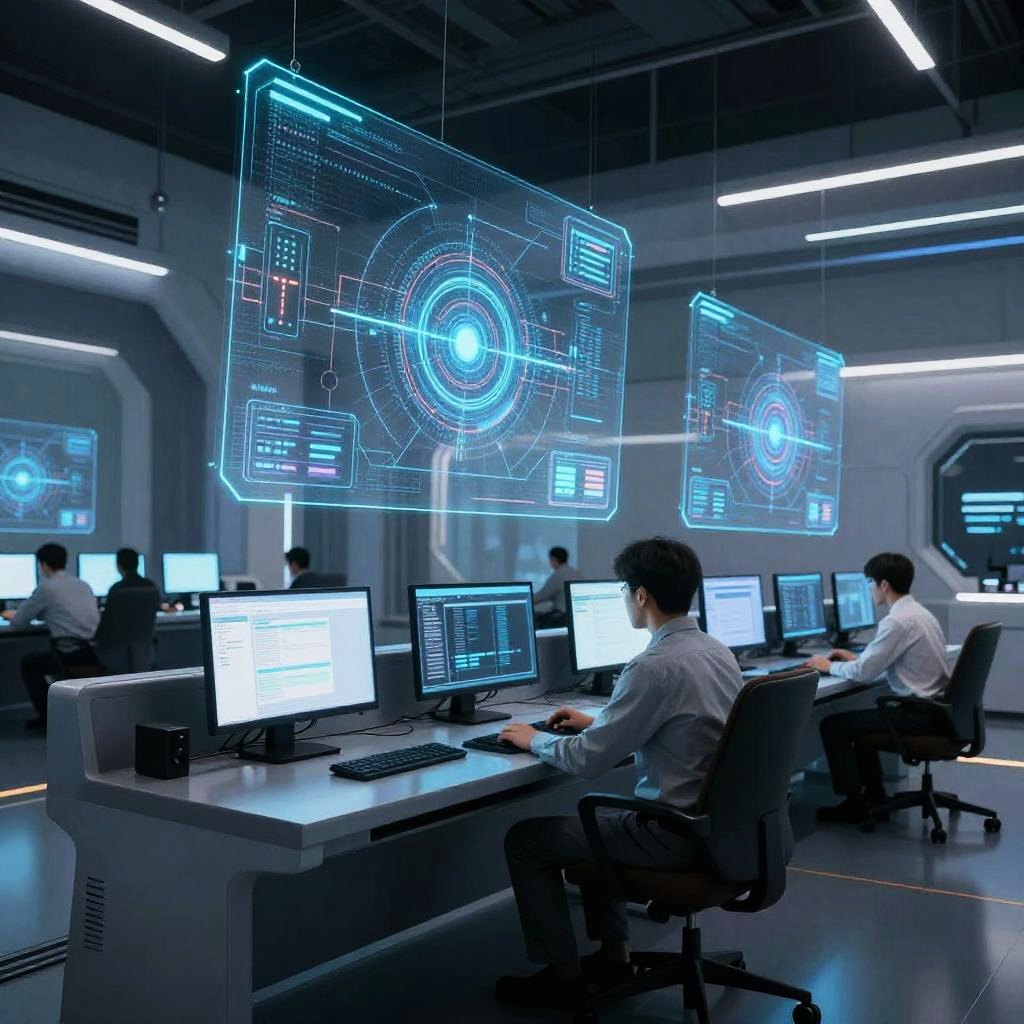 Futuristic control room with sdxl comfyui workflow displayed across multiple transparent monitors, advanced holographic projections, cool blue and teal color scheme, modern architecture with ergonomic design, ambient light reflections, high-tech aesthetic