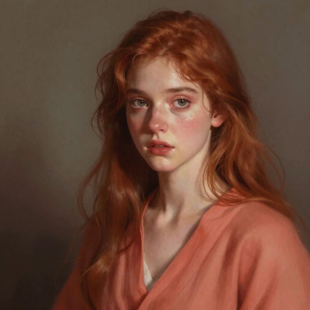 Soft anime‑style digital painting of a beautiful young woman with long flowing auburn hair and expressive eyes, wearing a draped coral garment, gently illuminated by diffused light in a muted, enclosed setting, her gaze direct and emotional, detailed facial features and soft textures with pastel highlights, conveying a mood of quiet vulnerability and intimacy
