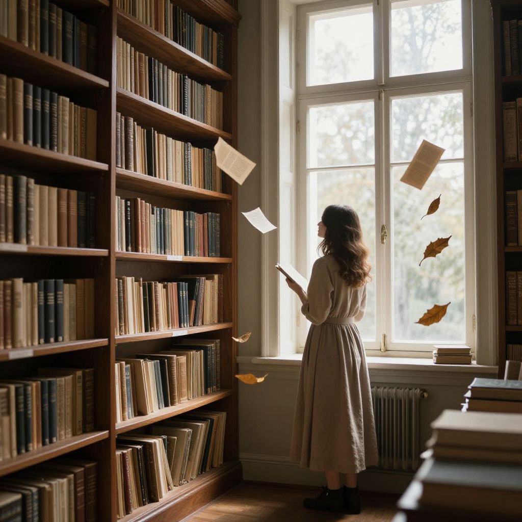 Photograph of a woman with wavy brown hair, wearing a beige, long-sleeve, knee-length dress, standing in a sunlit library. She faces a large window, reaching for falling papers. The room is filled with tall, wooden bookshelves filled with books of varying colors. Light filters through the window, casting a warm glow. Several yellowed leaves float in the air. The background shows a bright, slightly blurred outdoor view through the window. The scene exudes a serene, scholarly ambiance.