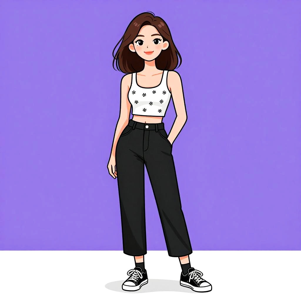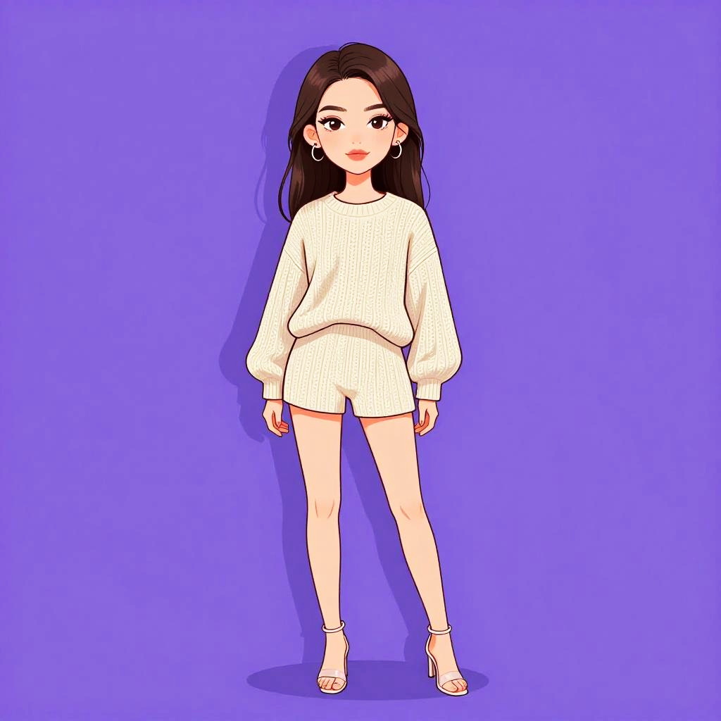 Illustration of a young woman with long braided brown hair wearing a white oversized cropped sweatshirt with drop-shoulder sleeves and ribbed cuffs. She is dressed in high-waisted cycling shorts featuring a multicolored houndstooth pattern with a vertical blue stripe on the side. The outfit is completed with simple white sneakers. The background is plain purple with a subtle shadow, indicating indoor lighting.