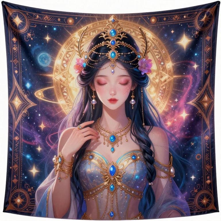 Digital painting of a serene, fair-skinned woman with long black hair, adorned with gold jewelry and blue gems, set against a cosmic, starry