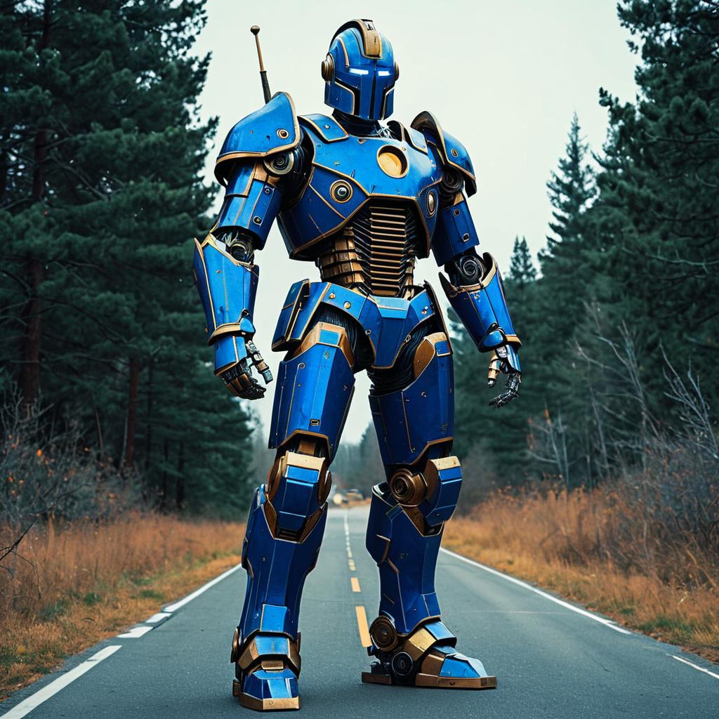An amazing piece of art, depicting a robotic knight from Marvel comics, full body, in the style of bronze and cobalt blue, Simon Stalenhag, sci-fi surrealism.
