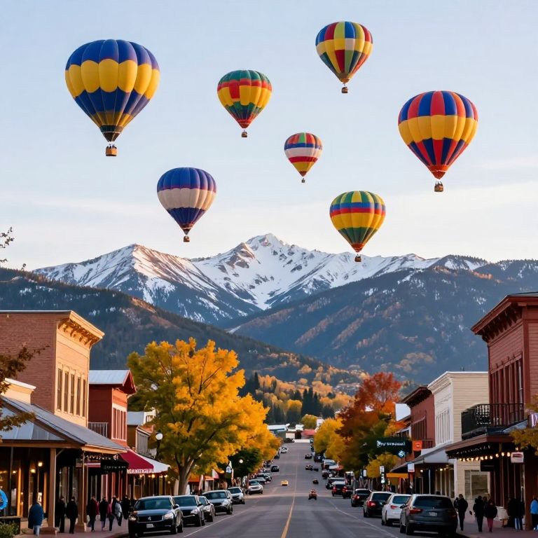 Vibrant hot air balloons float gracefully above a picturesque historic downtown street in Telluride, Colorado, with seven colorful balloons soaring against a backdrop of snow-capped mountains and autumn-hued trees lining the bustling road.