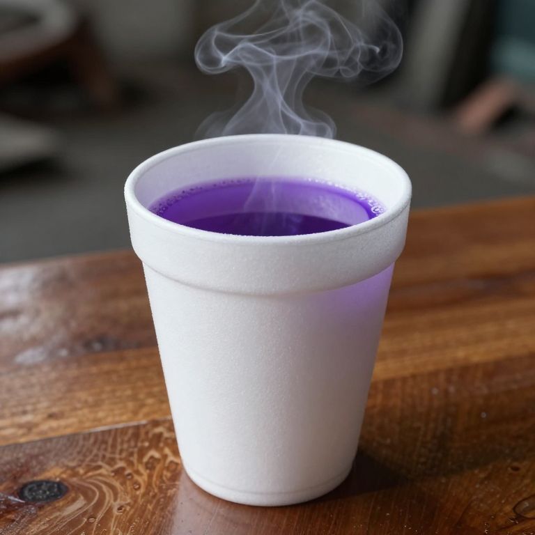 Color Mixing close up of a white styrofoam foam cup filled with a purple liquid on a shiny wood finish table, small smoke filled, apocalyptic setting, 4k render, hyper realistic, cinematic,