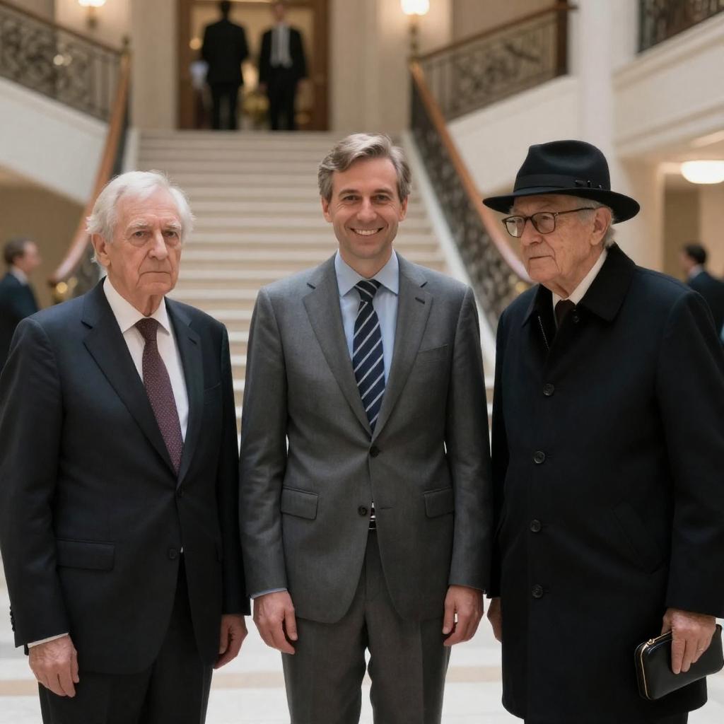 Photograph of three men in a grand building. Central man in grey suit, blue shirt, and striped tie smiles at elderly man on right in black coat, hat, glasses, and glasses case. Older man with stern expression stands on left. Background includes staircase, blurred people, and soft lighting.