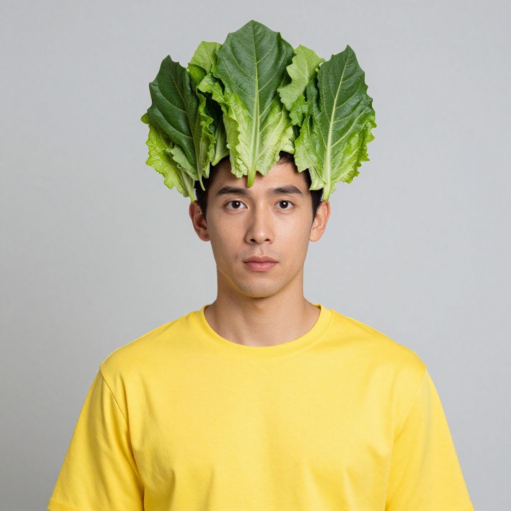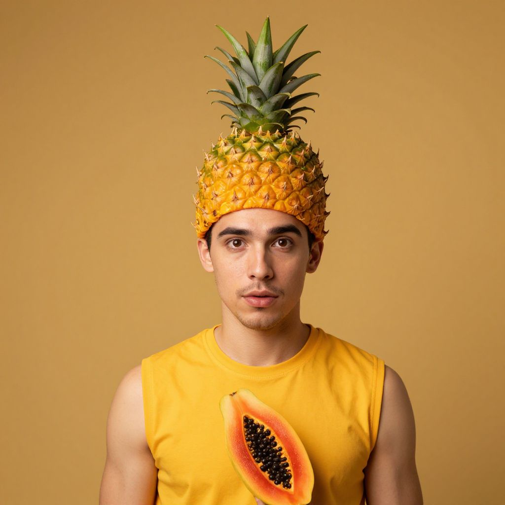 Photograph of a young man with light olive skin and dark brown eyes, wearing a bright yellow sleeveless shirt with a large slice of papaya graphic on the front. He has a pineapple hat on his head, with the green leaves and yellow skin of the pineapple prominently visible. The background is a solid, warm yellow, creating a cohesive color scheme. The man's expression is neutral, with slightly parted lips. The image has a playful and surreal style, combining fruit elements with human subjects.