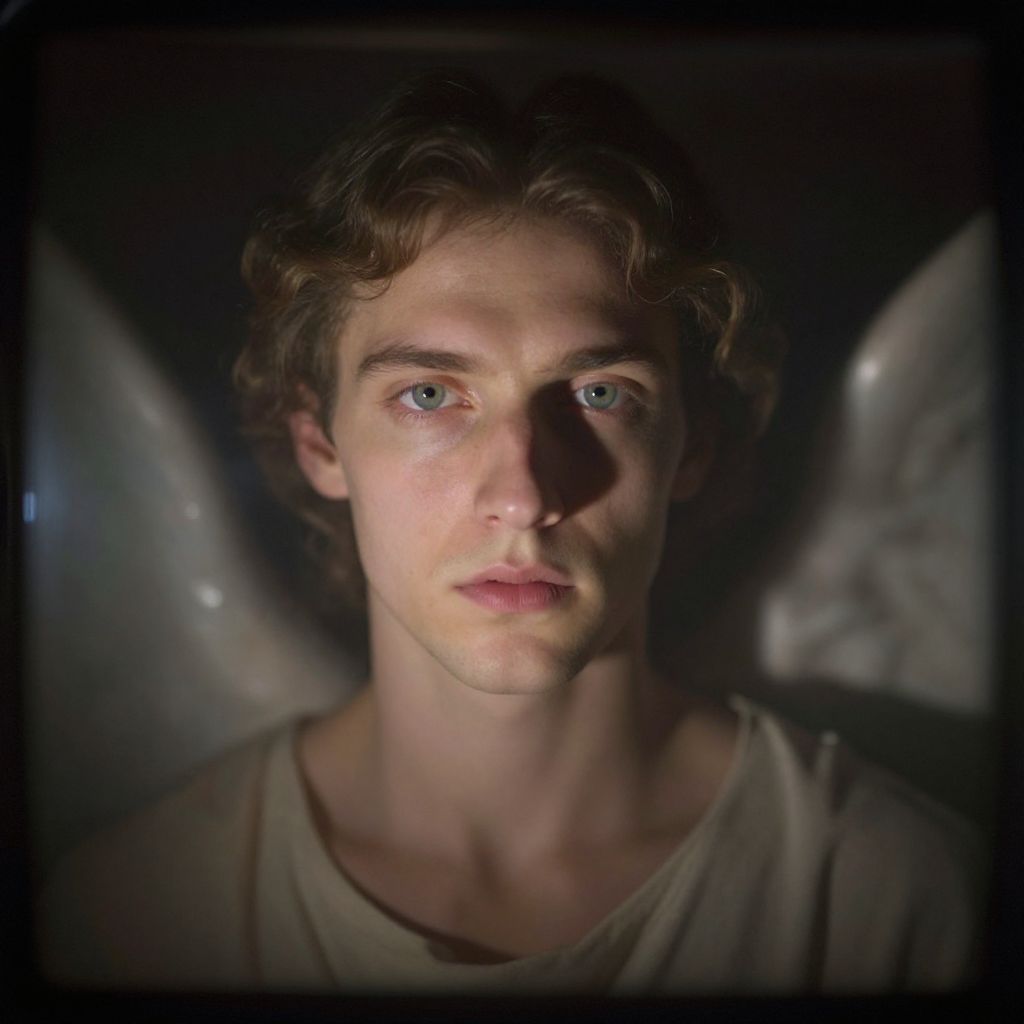 Enigmatic portrait of an angelic figure, reminiscent of Gabriel, bathed in soft, ethereal light emanating from unknown sources, as if captured within the mystical realm of a camera obscura. Delicate shadows dance across his countenance, imbuing him with an air of divine presence and ancient mystique. Man has masculine face and piercing eyes
