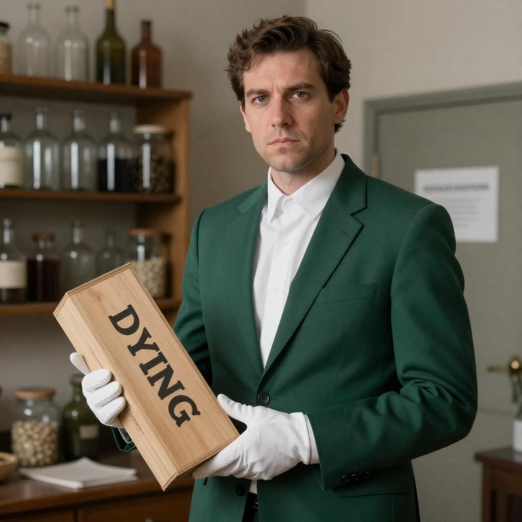 Photograph of a man in a green suit and white shirt, wearing white gloves, standing in a cluttered room with shelves of glass bottles and jars. He holds a wooden box labeled "DYING" and has a serious expression. Background includes a door with a sign.