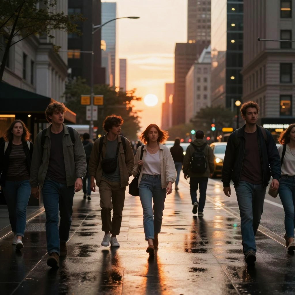 Stable diffusion prompts for photorealism illustrating a bustling city street scene at sunset, featuring realistic reflections on wet pavement, diverse pedestrians with detailed clothing textures, authentic architectural elements, and warm, dynamic lighting effects.