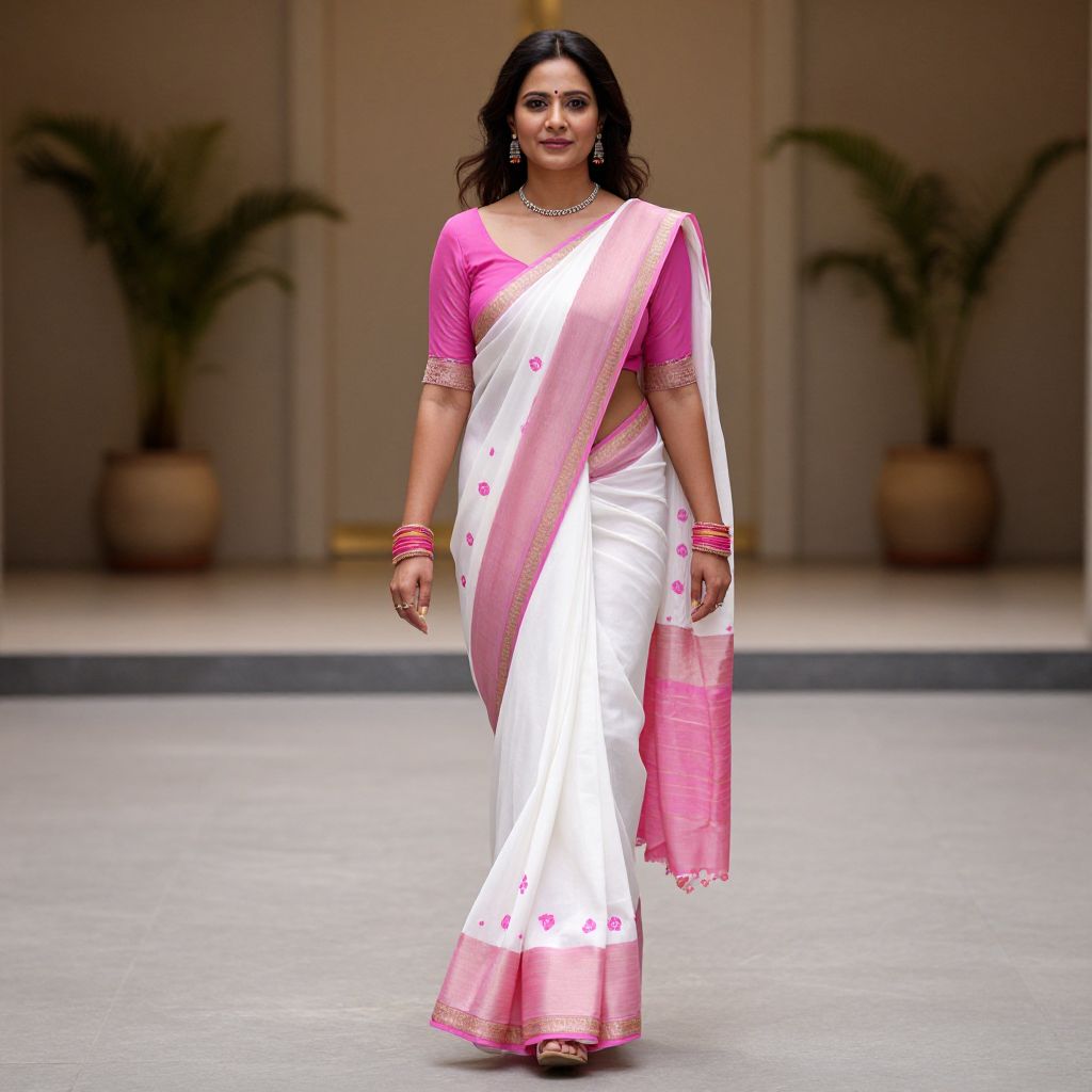 Indo Western Party Wear Woman Costume, a woman in a pink and white sari walking down a walkway