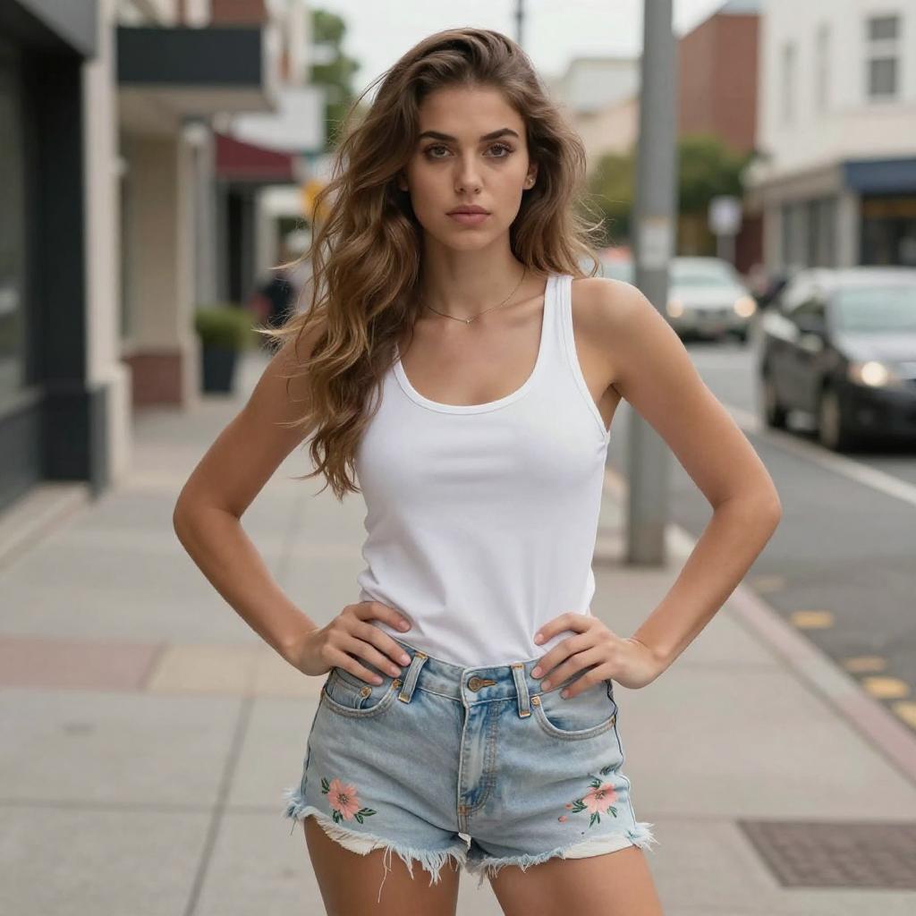 Photograph of a young woman with long, straight, light brown hair, standing on a sunlit street. She's wearing a white, short-sleeve t-shirt and light blue, slightly distressed jeans with a black belt. Her hands are in her pockets, and she's smiling softly. The background is slightly blurred, showing a bustling street with people and shop awnings, creating a warm, urban atmosphere.
