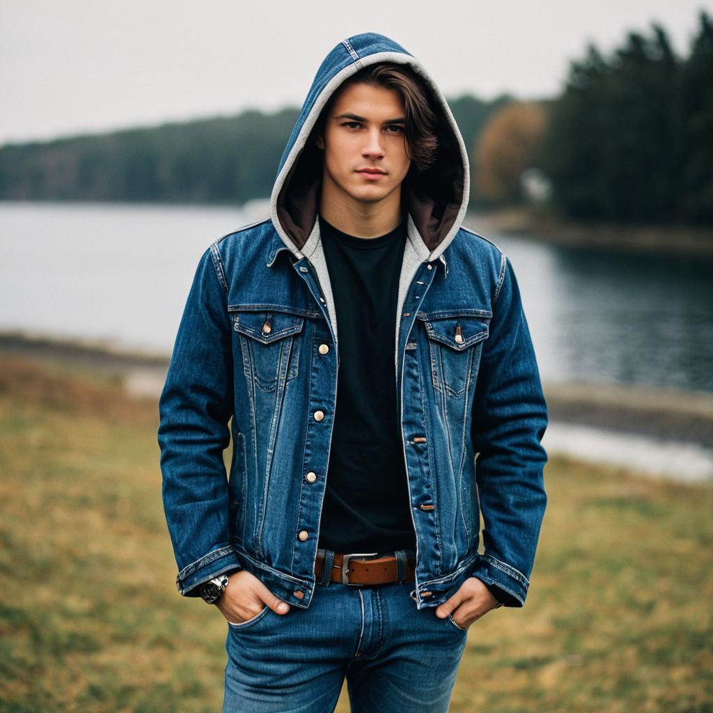Casual night out outfit male,male focus, 1boy, realistic, jacket, pants, jeans, denim, blue shirt, shirt, brown jacket, blurry, blurry background, looking at viewer, brown hair, standing, solo focus