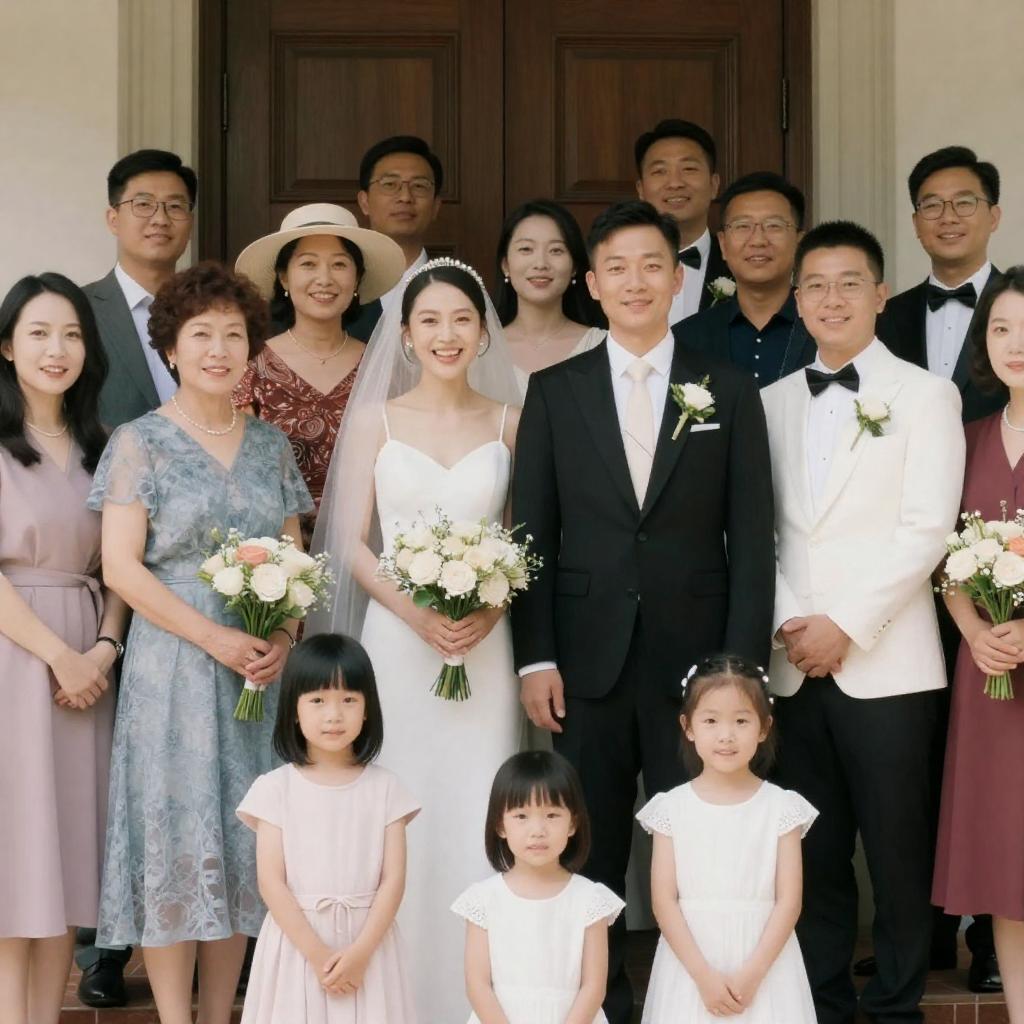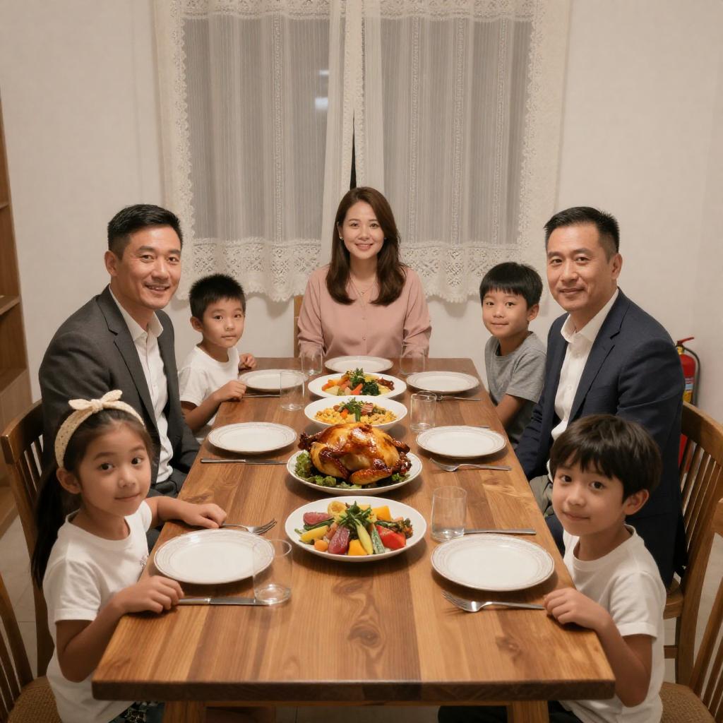 Family of eight sitting around a wooden dining table. Platters of food, including a roasted chicken and colorful dishes, in the center. Two men in suits, woman in pink blouse, three children, one in a headband. Casual, warm expressions. Lace curtains in background, red fire extinguisher on right.
