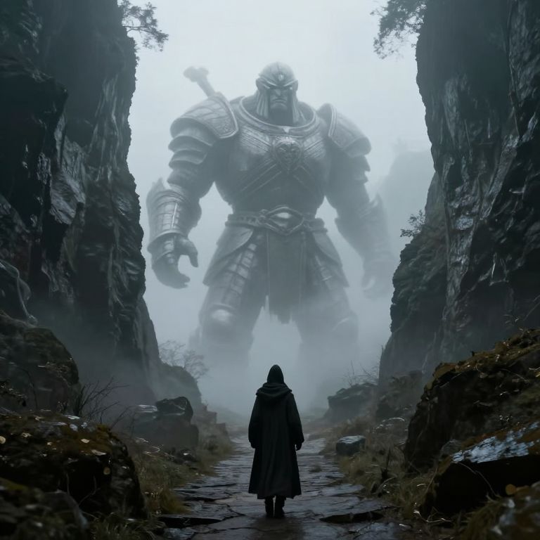 Digital artwork depicting a misty, rocky canyon with a tall, imposing, armored figure looming in the background. The massive creature, with intricate metallic armor and glowing eyes, stands between two towering, dark cliffs. In the foreground, a hooded figure in a long, dark cloak walks away from the viewer, centered on a wet, cobblestone path. The mist obscures the creature's lower half, adding a sense of mystery and foreboding. The color palette is dominated by dark blues and grays, with a bright, white light emanating from the creature's head, contrasting the gloomy surroundings.