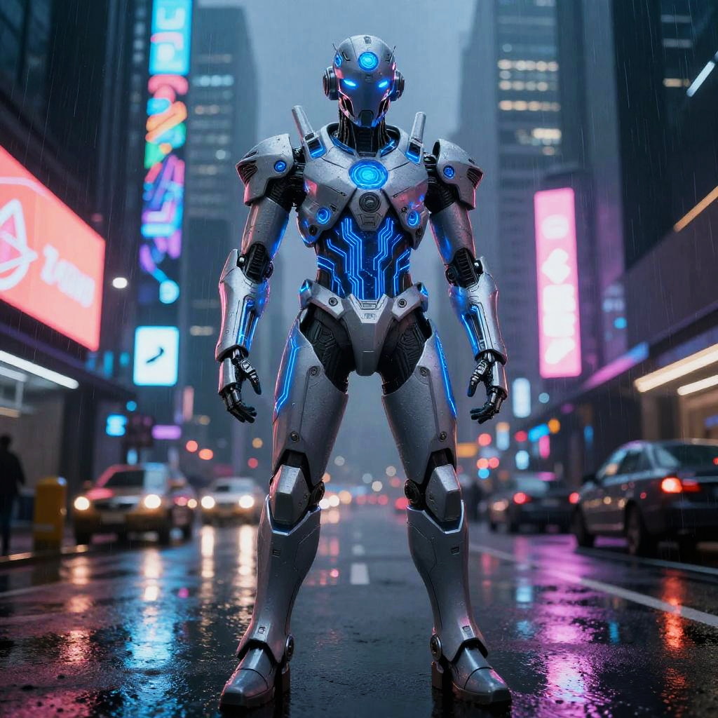 Photorealistic digital artwork depicting a futuristic, humanoid robot standing in a neon-lit, rainy urban street. The robot is metallic silver with blue neon accents, glowing blue eyes, and intricate mechanical armor. It stands in the center of a wet, reflective road with blurred city lights and neon signs in the background. The scene includes cars with headlights on, parked on both sides of the street, and tall buildings with vibrant, colorful advertisements. The atmosphere is cyberpunk, with a moody, rainy night ambiance. The robot's design is sleek and futuristic, with a strong, imposing stance.