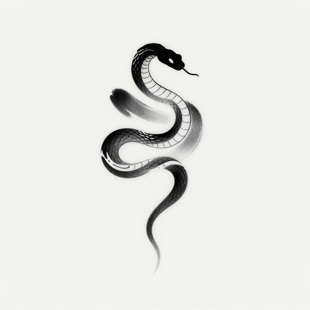 This is a digital black and white drawing of a coiled snake, rendered in a minimalist style. The snake's body is composed of smooth, flowing black lines with gradient shading, creating a sense of depth and texture. Its head is raised, with a small, pointed tongue visible. The snake's scales are depicted as a series of horizontal white lines along its body. The background is plain white, making the snake the focal point. The drawing uses a combination of thick and thin lines to convey movement and form, with a slight blur effect around the snake's midsection, adding a dynamic feel.