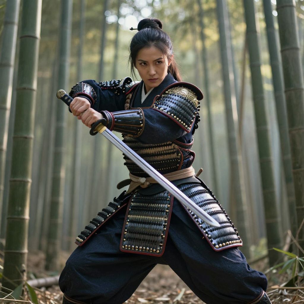 Woman warrior images featuring a powerful female samurai in traditional armor, poised in a bamboo forest, holding a katana ready for combat, intricate armor details, soft morning light filtering through the trees, cinematic and dynamic composition, high realism.