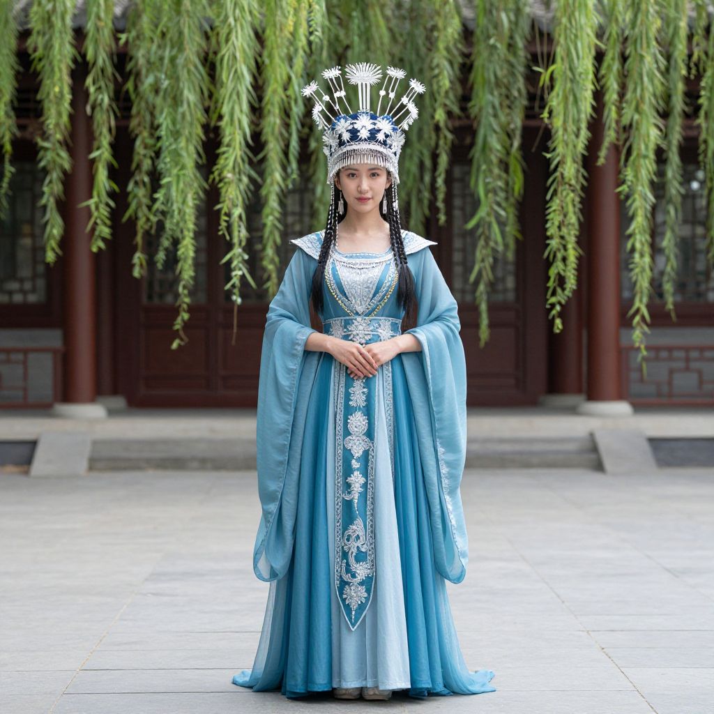 Photograph of an Asian woman standing outdoors in front of a traditional Chinese building with dark wooden doors and hanging green willow branches. She wears an elaborate, light blue, long-sleeved traditional Chinese dress adorned with white floral patterns and a white embroidered front panel. Her black hair is styled in long braids, and she wears a white, ornate headdress with tall, white, feather-like decorations. She stands with her hands clasped in front of her, on a gray stone pavement. The image has a bright, even lighting and a clear, detailed focus on her and her attire.