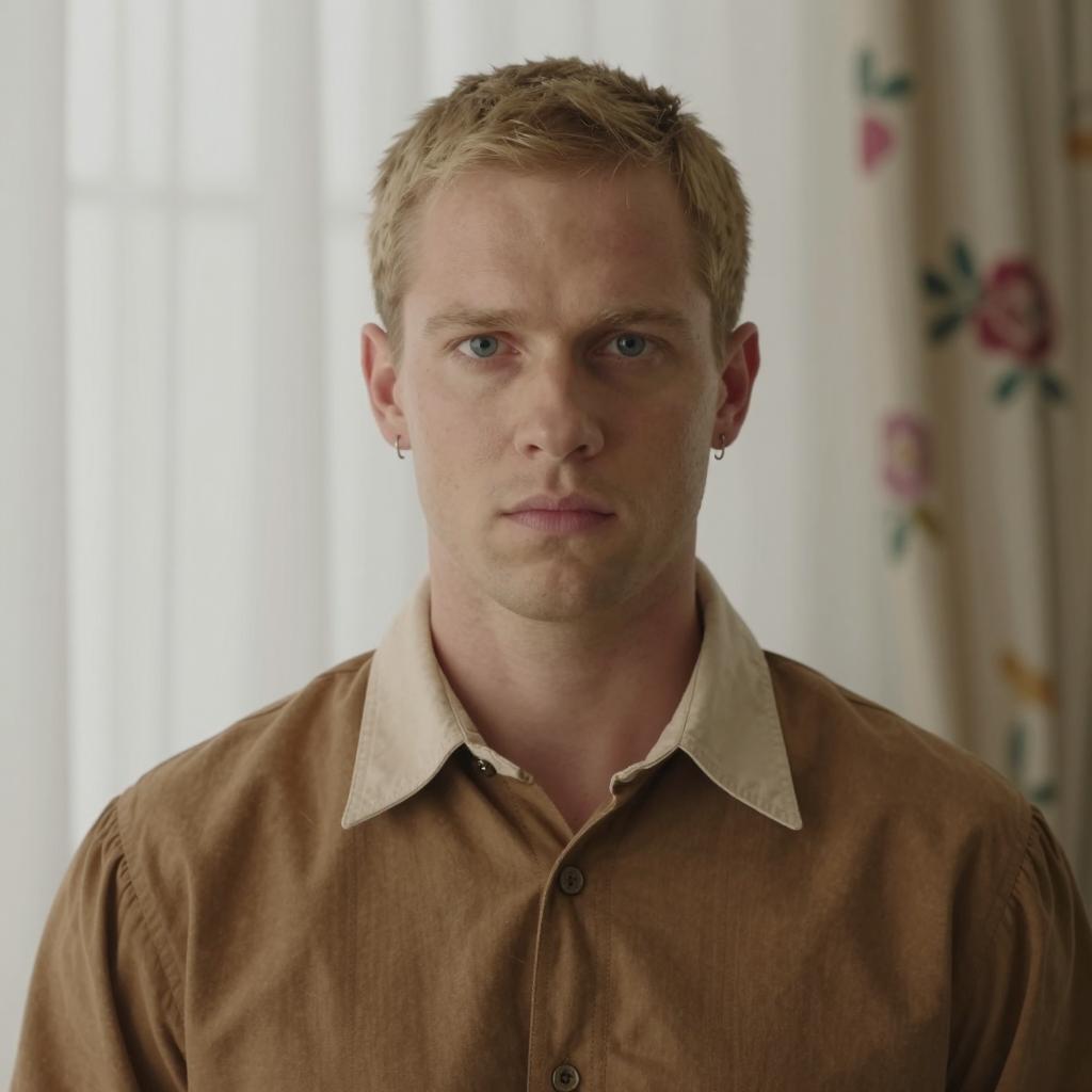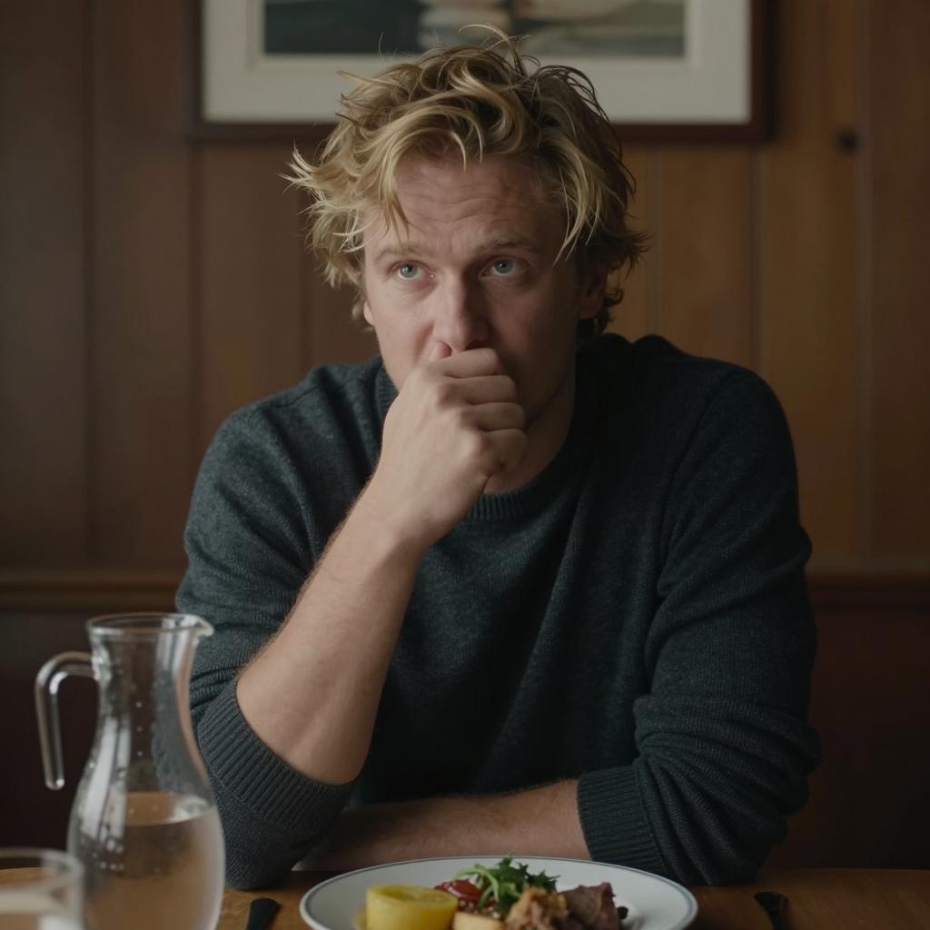 Photograph of a man with tousled blonde hair, wearing a dark sweater, sitting at a wooden table. He covers his mouth with his hand while looking to the side. A glass jug and a plate of food are in front of him. The background has a wooden wall with a framed picture. The lighting is dim and warm.