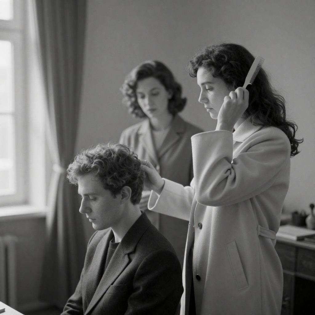 Black-and-white photograph of three people in a room. A woman in the foreground adjusts her hair with a comb, wearing a light coat. Two others, a man and a woman, sit behind her, the man leaning forward and the woman looking down. Curtains and a window are in the background.