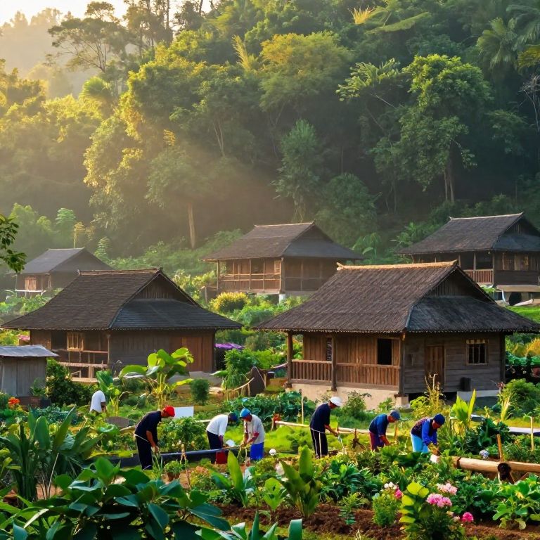 Geern village scene at dawn, rustic wooden houses surrounded by dense green foliage, villagers in traditional attire tending to gardens, soft sunlight filtering through thick canopy, warm and inviting atmosphere with painterly textures.