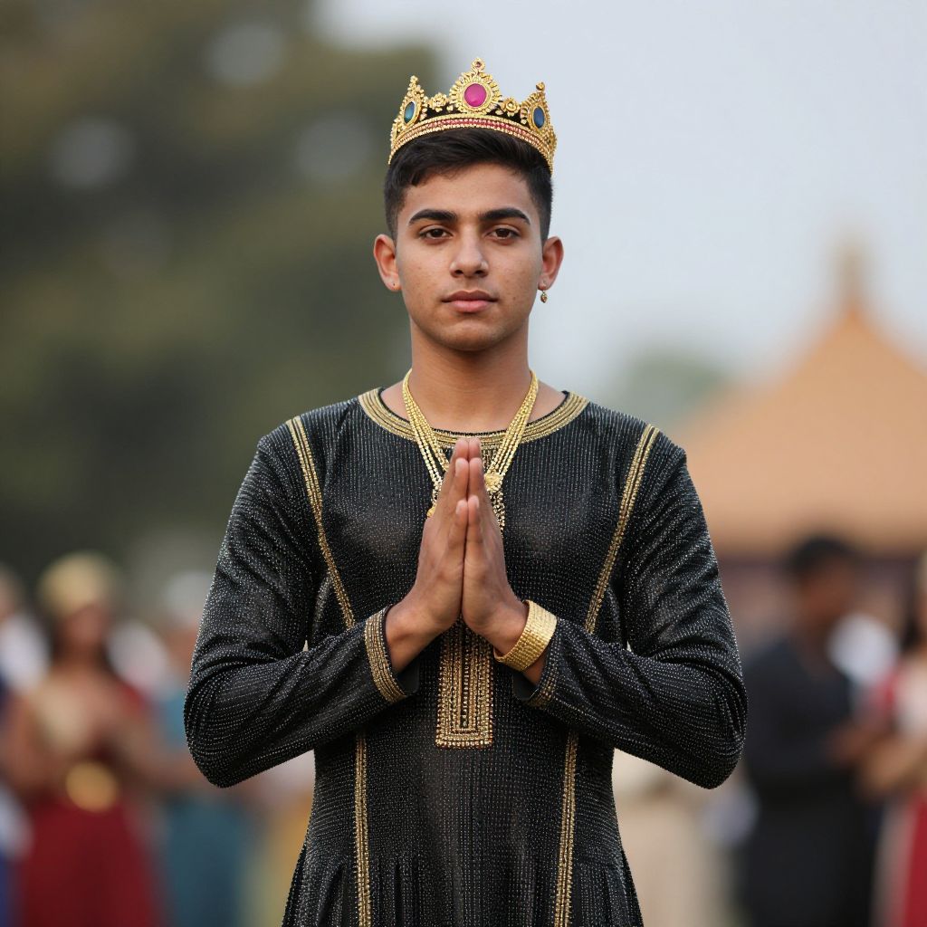 Masskara festival dress, solo, crown, outdoors, 1boy, looking at viewer, male focus, long sleeves, blurry background, jewelry, standing, blurry, own hands together