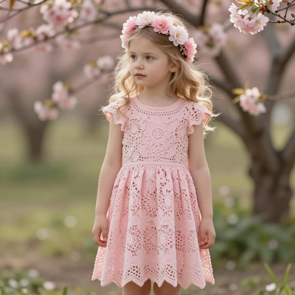 Young Girl in Pink Crochet Dress in Blossom Garden