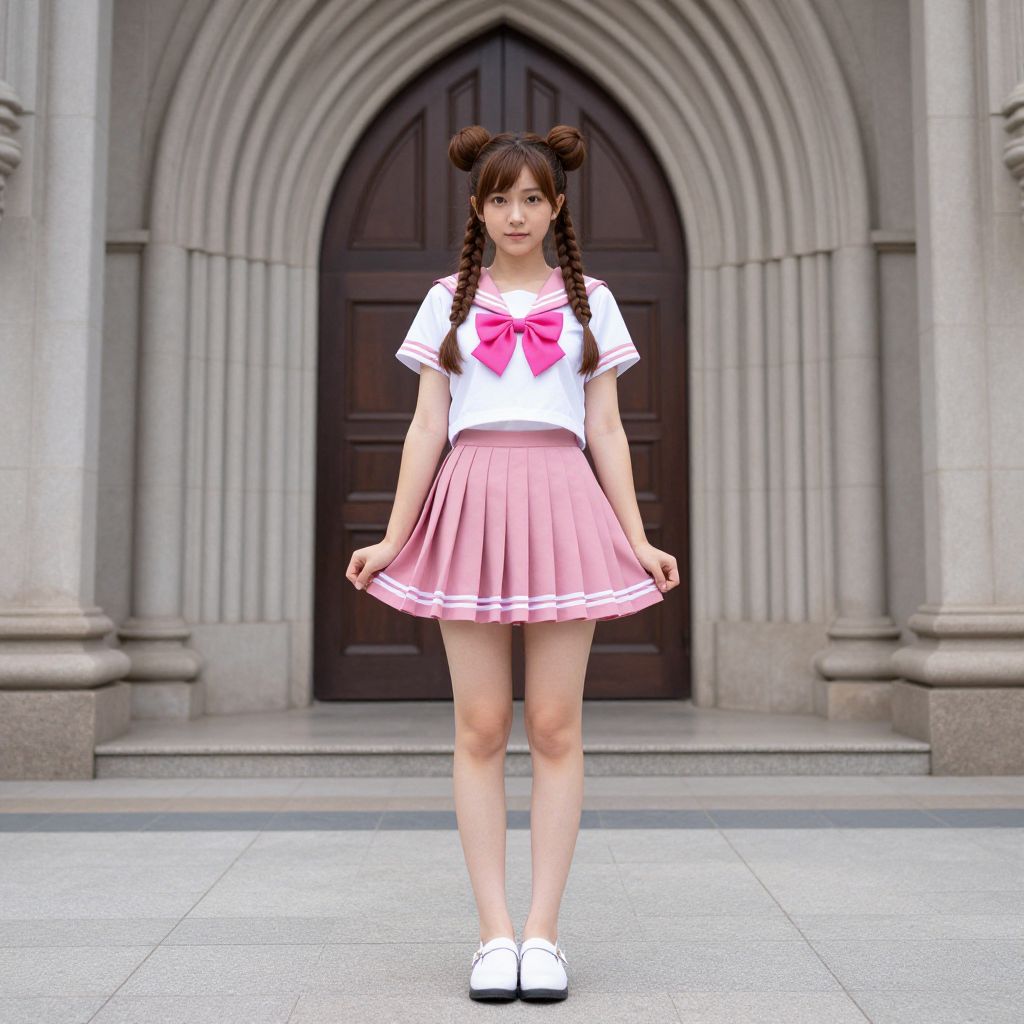 Pink sailor moon costume, 1girl, solo, skirt, double bun, braid, pink sailor collar, school uniform, twin braids, pink skirt, serafuku, brown hair, sailor collar, hair bun, parody, church, realistic, standing, full body, pink bow, asian, pleated skirt, bow