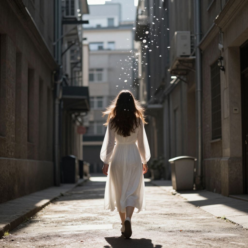 A woman in a flowing white dress walks away down a sunlit alley, her silhouette framed by cascading dandelion seeds floating gracefully above her head against the backdrop of towering urban structures.