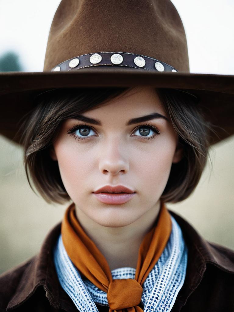 Close-up portrait of a young woman with blue eyes and short brown hair wearing a brown cowboy hat with metal studs and a mustard neckerchief over a blue and white patterned shirt. The image has a realistic style with a blurred background.