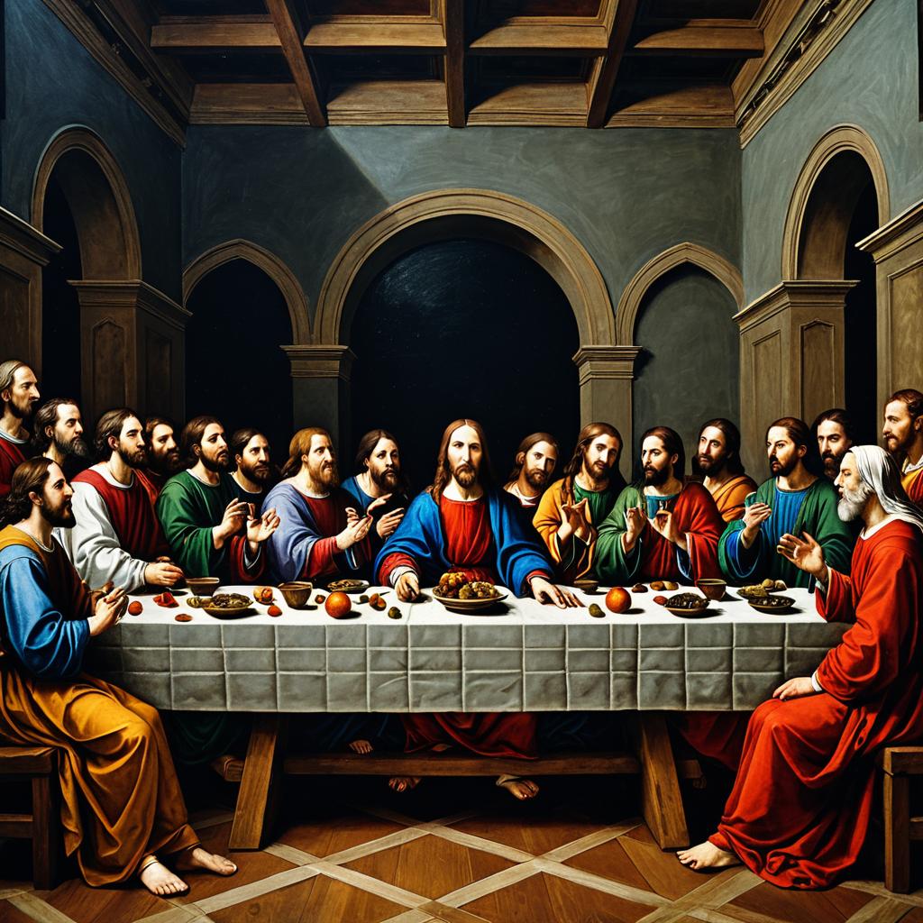 A detailed reimagining of Leonardo da Vinci's Last Supper featuring a gathering of renaissance scholars and mythical creatures in a classical setting. The painting exhibits expressionistic style with bold color schemes and dynamic composition, blending historical and fantastical elements on a dramatic architectural backdrop.