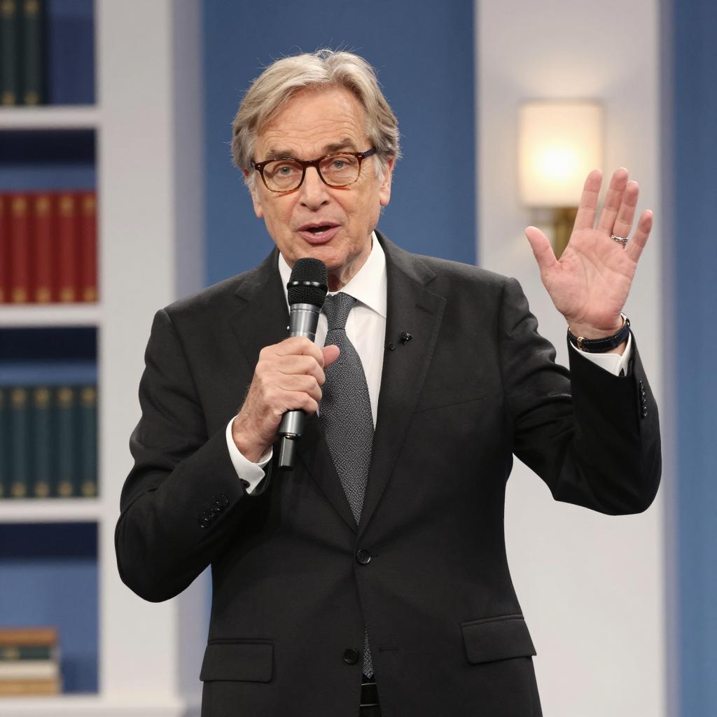A man with light brown hair, wearing a black suit, white shirt, and striped tie, standing behind a desk. He is gesturing with his right hand. A large map of the world in brown and blue is behind him. His expression is confident. The desk has papers and a pen.
