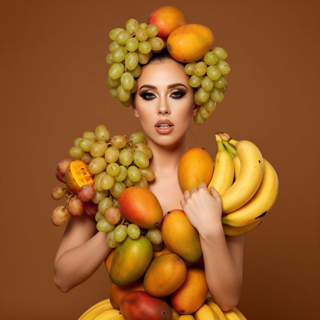 A beautiful woman is artistically adorned with an array of fruits, including grapes, mangos, and bananas, creating a vibrant and eye-catching look. Her fruit-covered ensemble and the warm, earthy background make for a striking and award-winning artistic photograph.