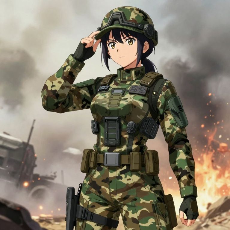 Military uniform anime style, featuring a young female soldier in detailed camo fatigues with futuristic armor elements, standing confidently against a smoky battlefield backdrop, vibrant color palette, dynamic pose, and expressive eyes.