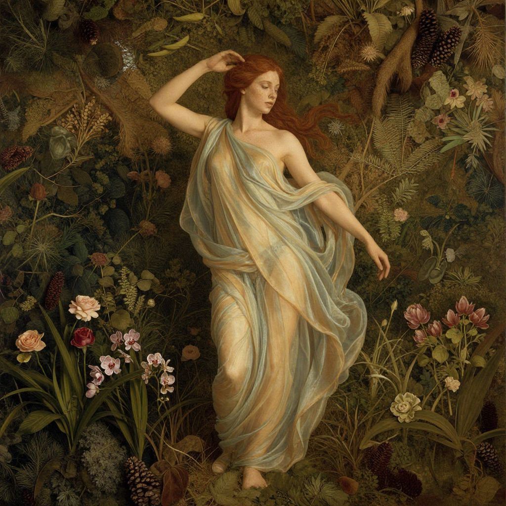 The image depicts a serene and ethereal scene featuring a female figure, reminiscent of classical mythology, surrounded by an intricate tapestry of nature. The figure, with ginger hair and freckles, is adorned with delicate, flowing drapery that blends seamlessly with the surrounding flora. The background is a lush, verdant garden, teeming with various plants and flowers, including roses, orchids, and pine cones, creating a sense of harmony between the human form and the natural world. The composition is rich in texture, with the soft, opalescent drapery contrasting against the rough, organic shapes of the plants. The overall color palette is warm and earthy, with shades of gold, green, and brown dominating the scene. The figure's pose is graceful and poised, suggesting a moment of contemplation or connection with the natural world. The image evokes a sense of mysticism and the divine, with elements of alchemy, mythology, and nature intertwined in a visually captivating manner.