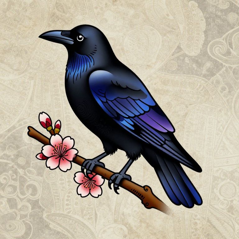 Neo trad raven tattoo featuring a sleek black raven with vivid blue and purple highlights, perched on a blooming cherry blossom branch, intricate line work with bold shading, set against a muted vintage background, capturing classic and modern tattoo styles blending seamlessly.