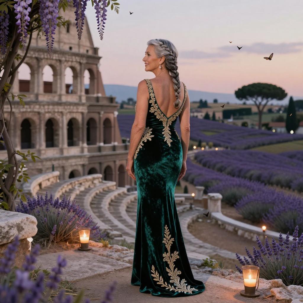 Masterpiece, best quality, (photorealistic:1.4), full body, ultra-detailed photo of a mature olive-skinned Mediterranean woman with salt-and-pepper hair styled in an elaborate rope braid, elegant posture with faint smile lines, hourglass silhouette, viewed completely from behind, wearing a shimmering emerald velvet evening gown with delicate gold filigree embroidery, standing in a crumbling ancient stone amphitheater overgrown with wisteria and moonflowers, scattered torchlight and moths, overlooking a lavender valley at dusk, smiling with an hourglass silhouette, viewed completely from behind