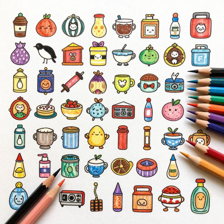 Traditional options of life, colorful pencil and wax drawing of 50000 different items in one picture, cute,