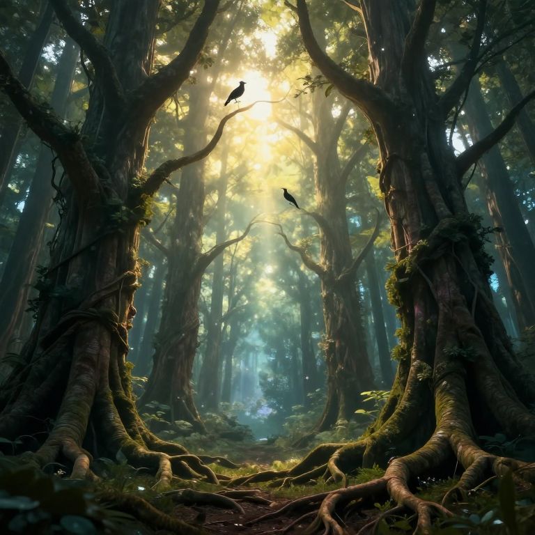 This digital artwork depicts a lush, mystical forest bathed in ethereal sunlight filtering through towering, ancient trees with thick, twisted trunks and sprawling roots. The forest floor is densely covered with green foliage and moss. Three birds perch on the upper branches of the trees, which frame the sunlit background. The light creates a soft, glowing effect, highlighting the verdant canopy and casting dappled shadows. The overall atmosphere is magical and serene, with a combination of dark and light tones creating a sense of depth and tranquility. The image has a realistic yet slightly fantastical style.