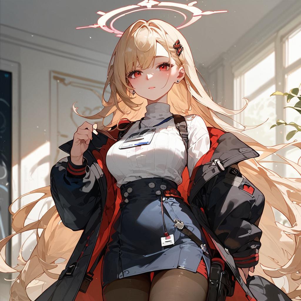Score_9, score_8_up, score_7_up, source_anime, cowboy shot, looking at viewer, expressionless, rioba, red eyes, ringed eyes, white pupils, halo, medium breasts, very long hair, hairclip, black jacket, id card, white turtleneck, black skirt, thigh holster, pantyhose, holding tablet pc, indoors, futuristic
