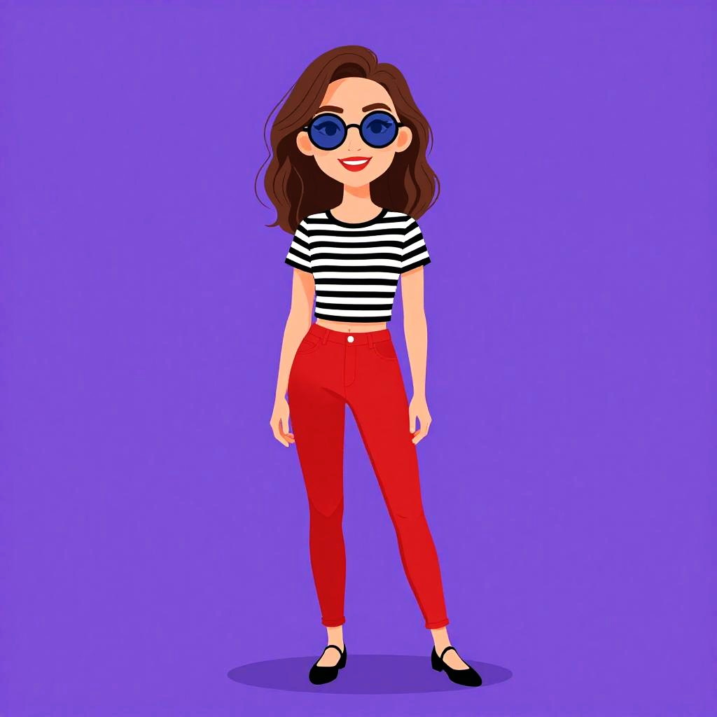 Woman with pretty face and pretty hair. Woman, nautical theme, sleeveless skater dress in navy blue and white horizontal stripes, square neckline, waist-cinching navy belt with bow, pleated skirt, mid-thigh length, brown wayfarer sunglasses, layered bracelets, casual outdoor market background. --sref 1467