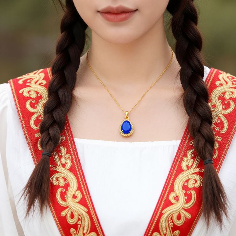 Female with braids in her hair, wearing a white dress with red and gold embroidery on the shoulders, and a gold necklace with a blue stone pendant hanging from it.