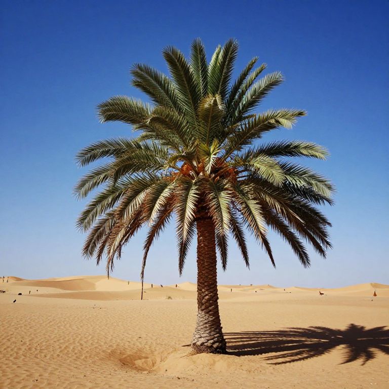 A single palmera in the middle of a desert oasis, surrounded by sand dunes under a bright blue sky, lush green leaves contrasting with the dry landscape, dramatic lighting with shadows, hyper-detailed with natural elements like birds and small animals