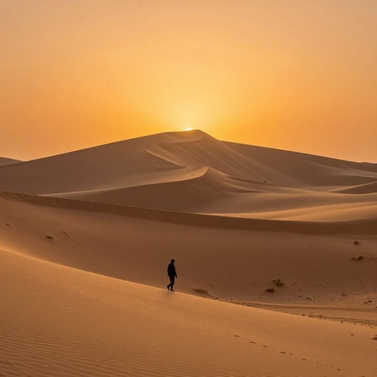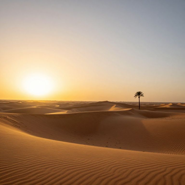 Photograph of a solitary palm tree with lush green fronds standing in a vast, sunlit desert with golden sand dunes under a clear, vibrant