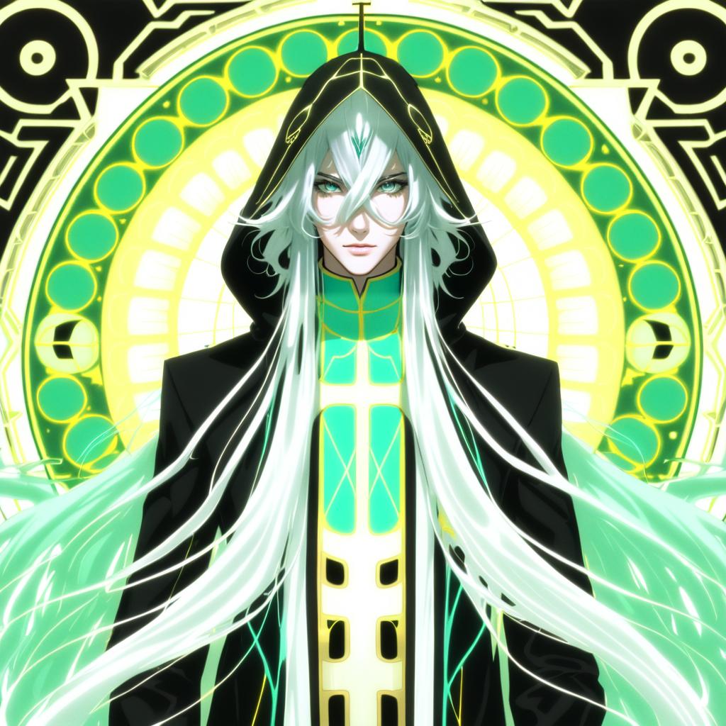 Asclepius (fate), fate (series), 1boy, hair between eyes, green eyes, white hair, long hair, very long hair, grey hair, crossed bangs, black jacket, long sleeves, hood up, by artist chups, anime