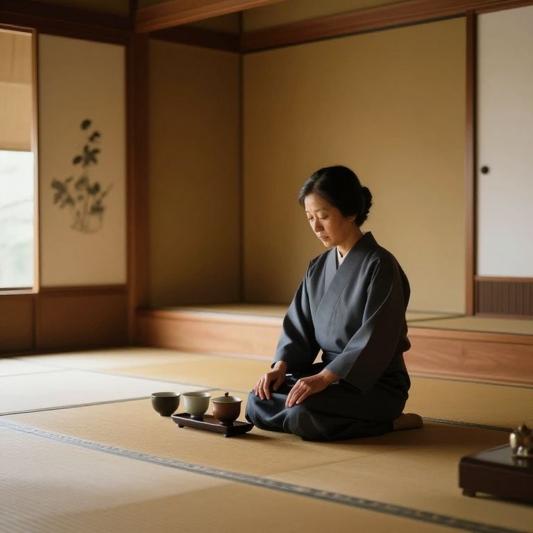 Amemiya peaceful tea ceremony scene inside a traditional tatami room, wooden interiors decorated with minimalist Japanese art, warm natural lighting, soft focus on the tea set, cultural and authentic atmosphere, realistic rendering