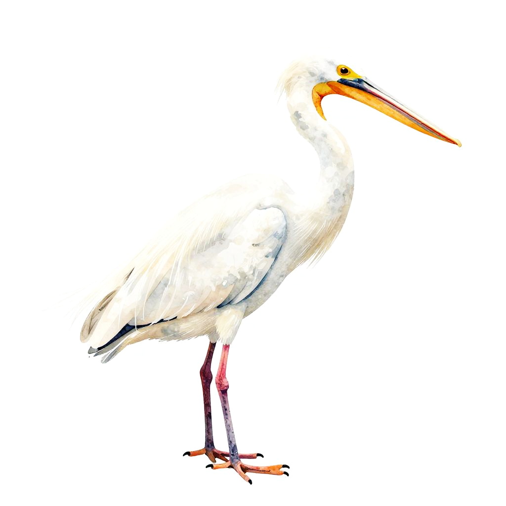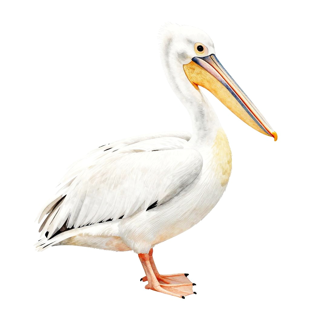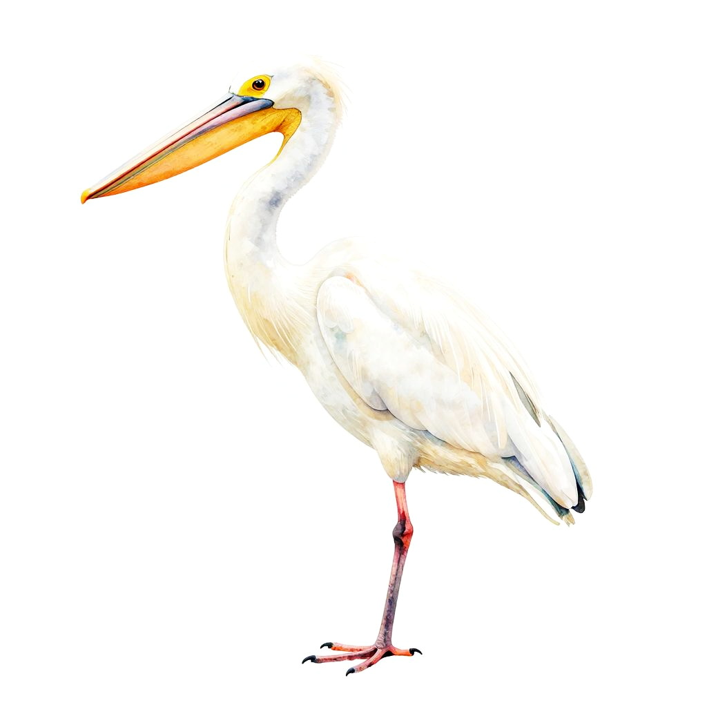 This is a digital watercolor-style illustration of a white Pelican with pure white wing feathers. The pelican has a long, orange beak and black eyes, standing on pinkish-orange legs. The bird is depicted in a side profile against a plain white background, creating a clean and simple look. The texture of the watercolor gives the feathers a soft, slightly blurry appearance.