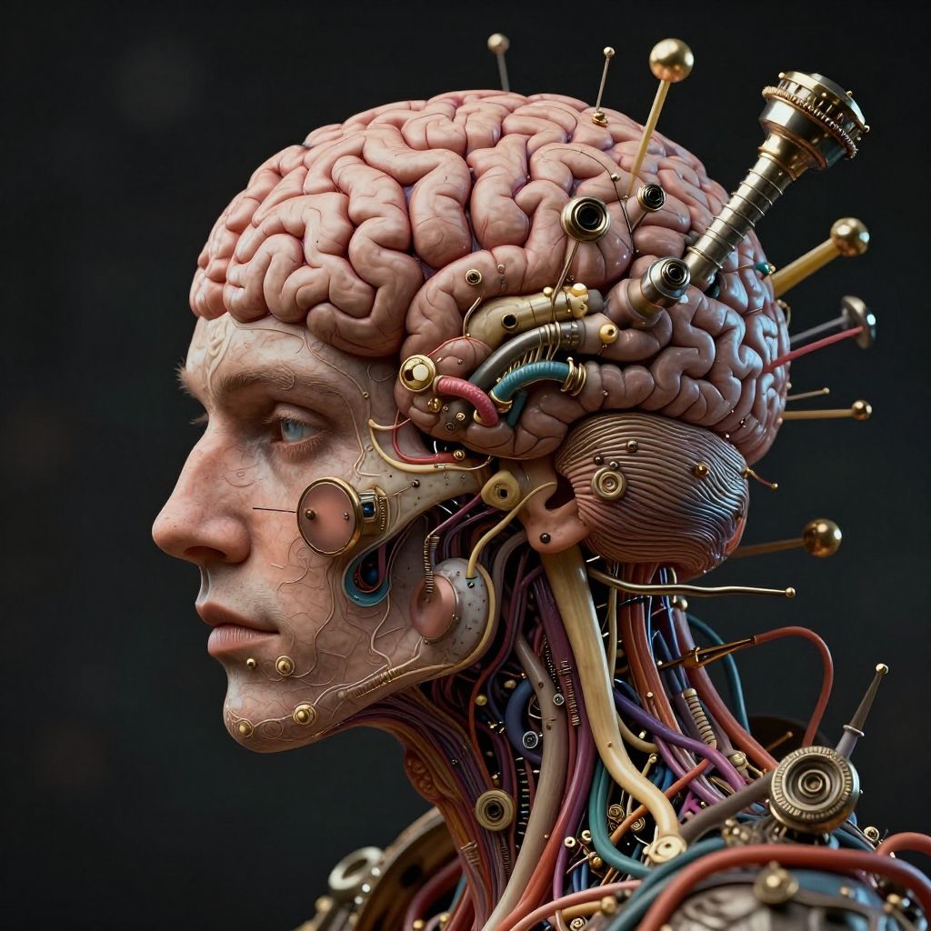 Detailed CGI portrait of a human head with exposed brain, intricate mechanical wires, and gears, set against a dark background.