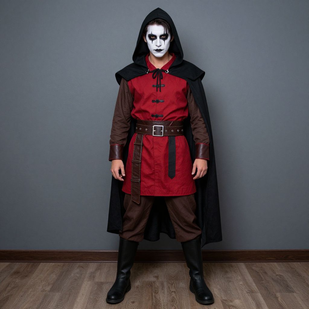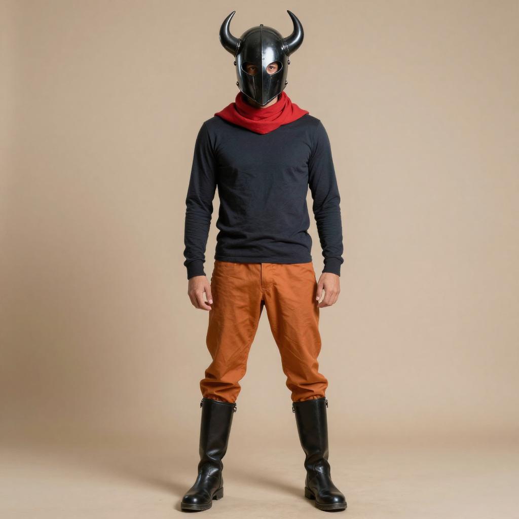Photograph of a man standing against a plain, beige background. He's wearing a shiny, black metal helmet with pointed horns, a dark long-sleeve shirt, and orange, loose-fitting pants. A red scarf is draped around his neck, and he has black, knee-high boots. His arms are relaxed by his sides, and he's looking directly at the camera. The lighting is even, highlighting the textures and colors of his outfit.