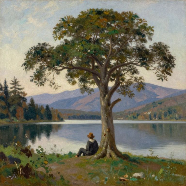 Realistic oil painting of a solitary person sitting under a large tree by a calm, reflective lake with mountainous background.